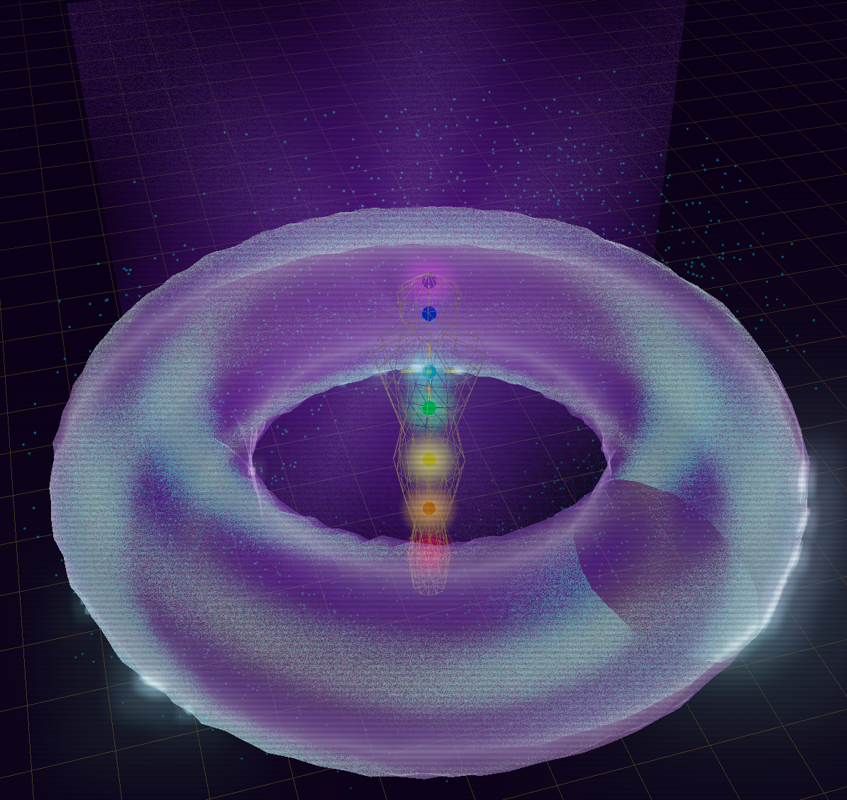 Seven luminous centers mapped for targeted broadcast interaction, each visually aligned to a distinct frequency and energetic function.