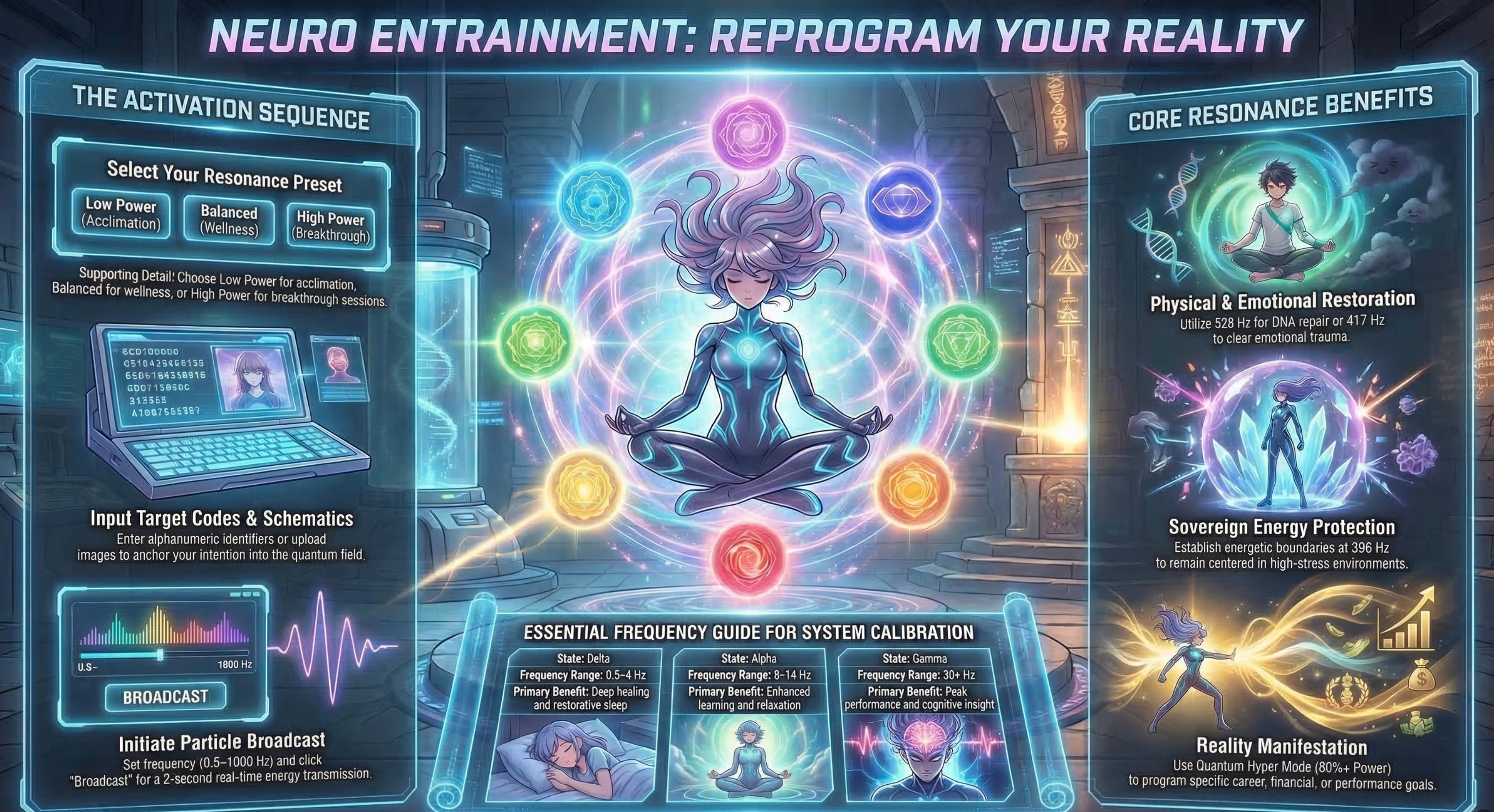 | Crown | #9D00FF | 963 Hz | Spiritual Unity | High-Intensity Plasma Flare |