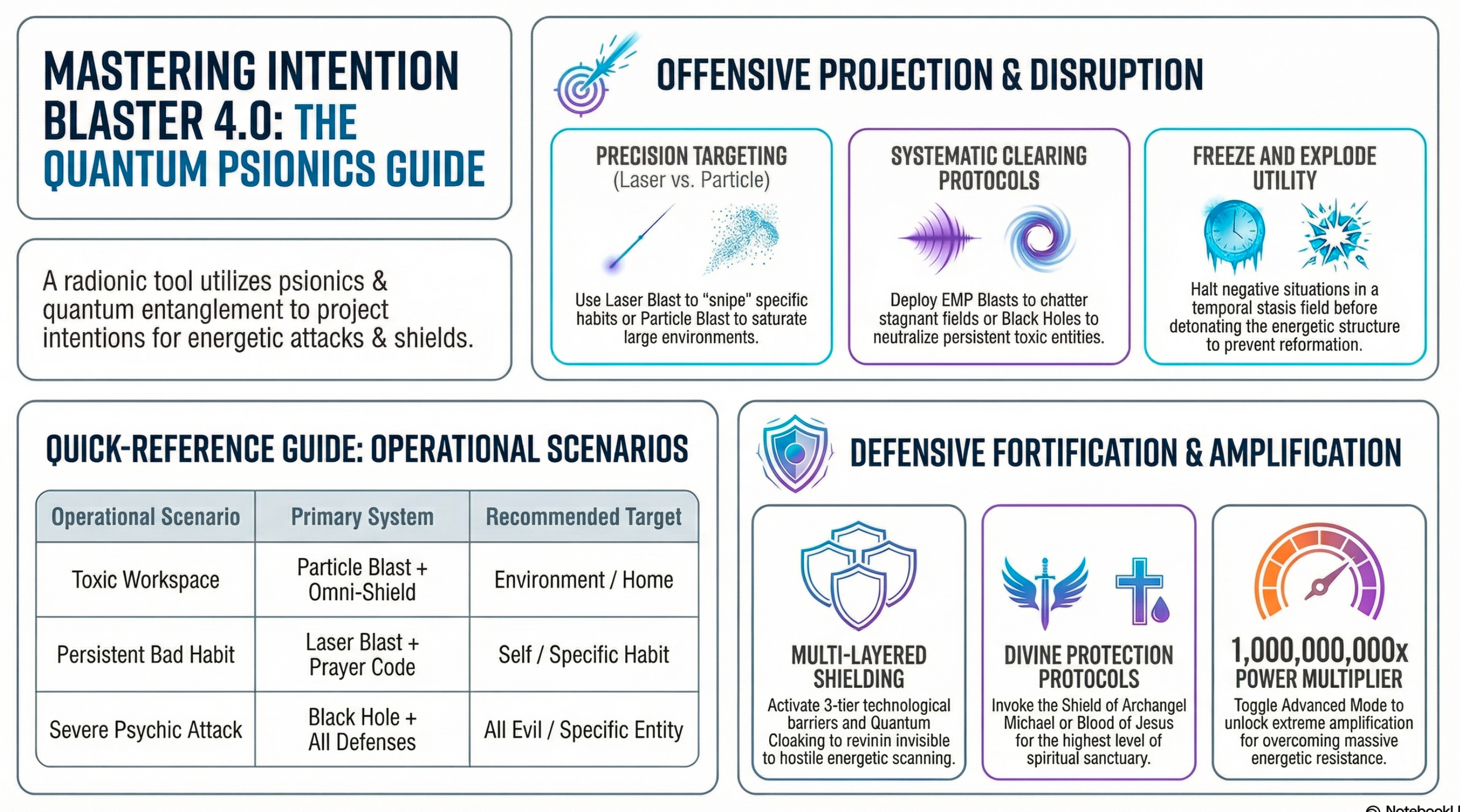 Intention Blaster 4.0 is a structured metaphysical practice tool designed to help users focus intention, direct visualization, reinforce prayer or affirmation work, and build protective or clearing rituals.