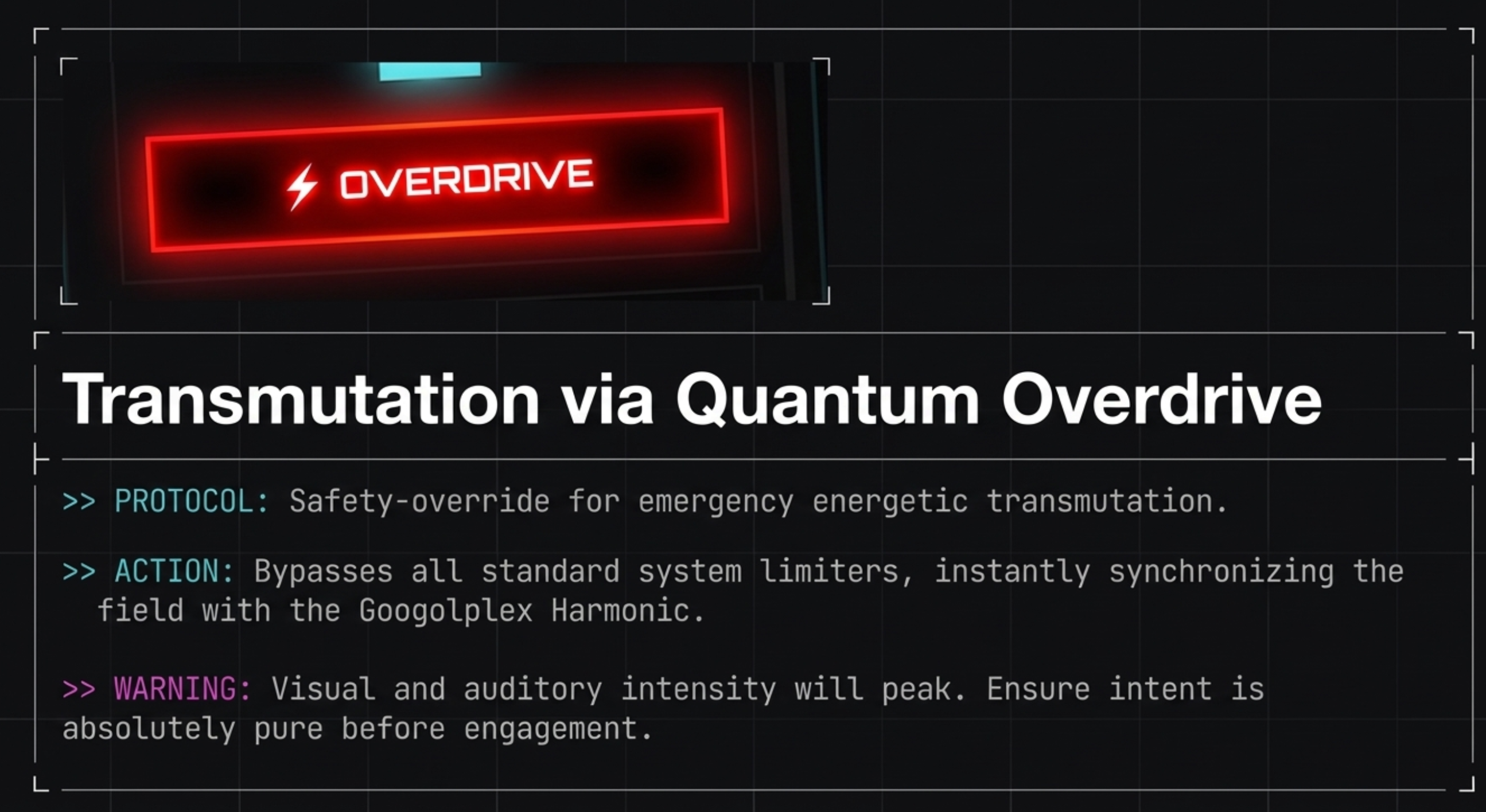 Safety-override protocol for emergency energetic transmutation. Temporarily bypasses standard limiters and pushes peak intensity. Use intentionally and responsibly.