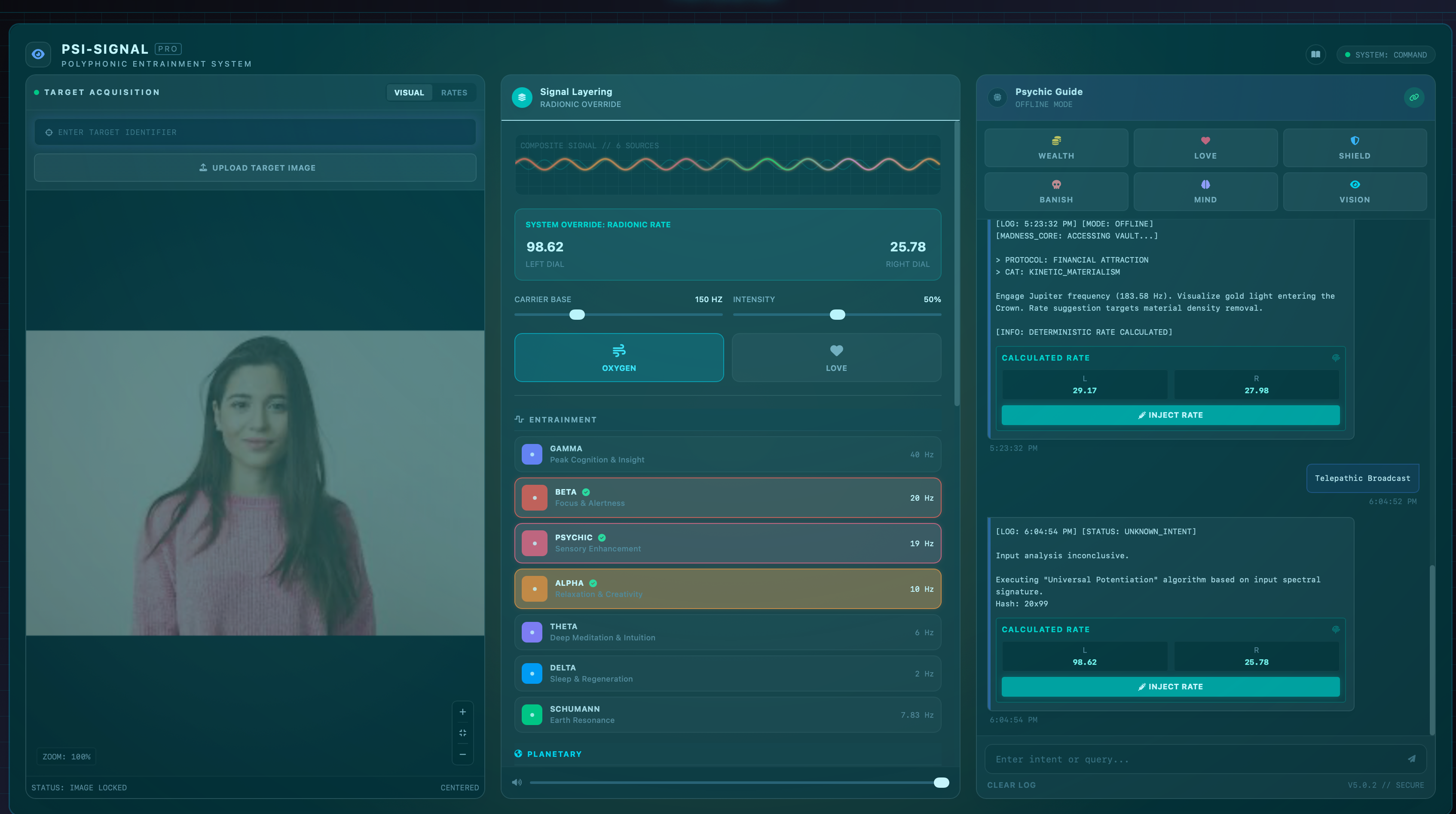 Psi Caster AI is a next-generation psychotronic interface that merges ancient frequency science with modern artificial intelligence. It is designed to translate intention into structured resonance using planetary tones, chakra alignments, sacred geometry, Solfeggio harmonics, and optional Rife frequency libraries.