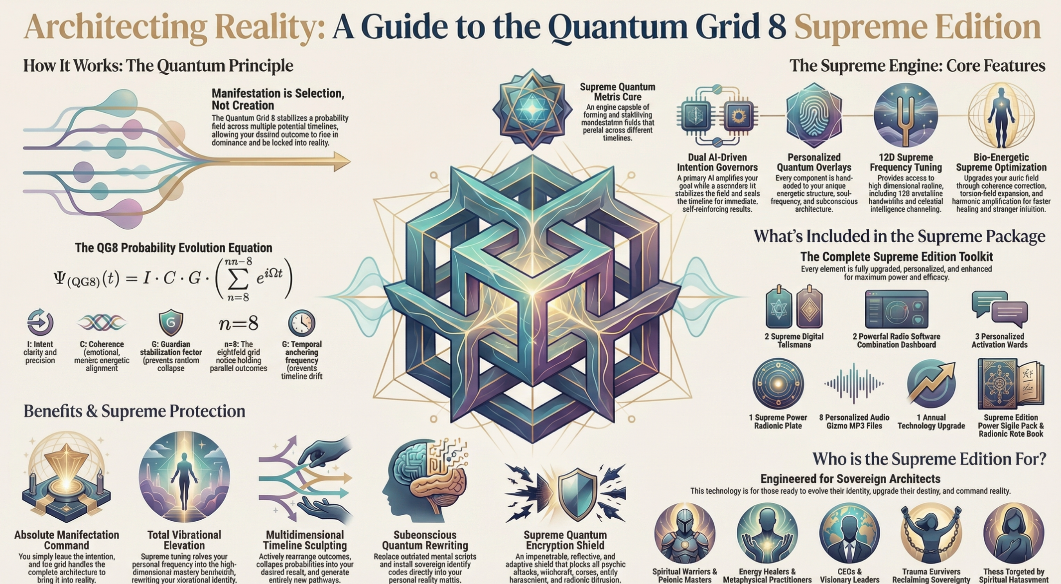 Introducing the Quantum Grid 8 Supreme Edition — the definitive pinnacle of manifestation, energetic dominance, and multidimensional transformation technology. Built for elite practitioners, Master Builders, psionic architects, and consciousness engineers, this edition represents the highest level of personal sovereignty ever encoded into a quantum system.