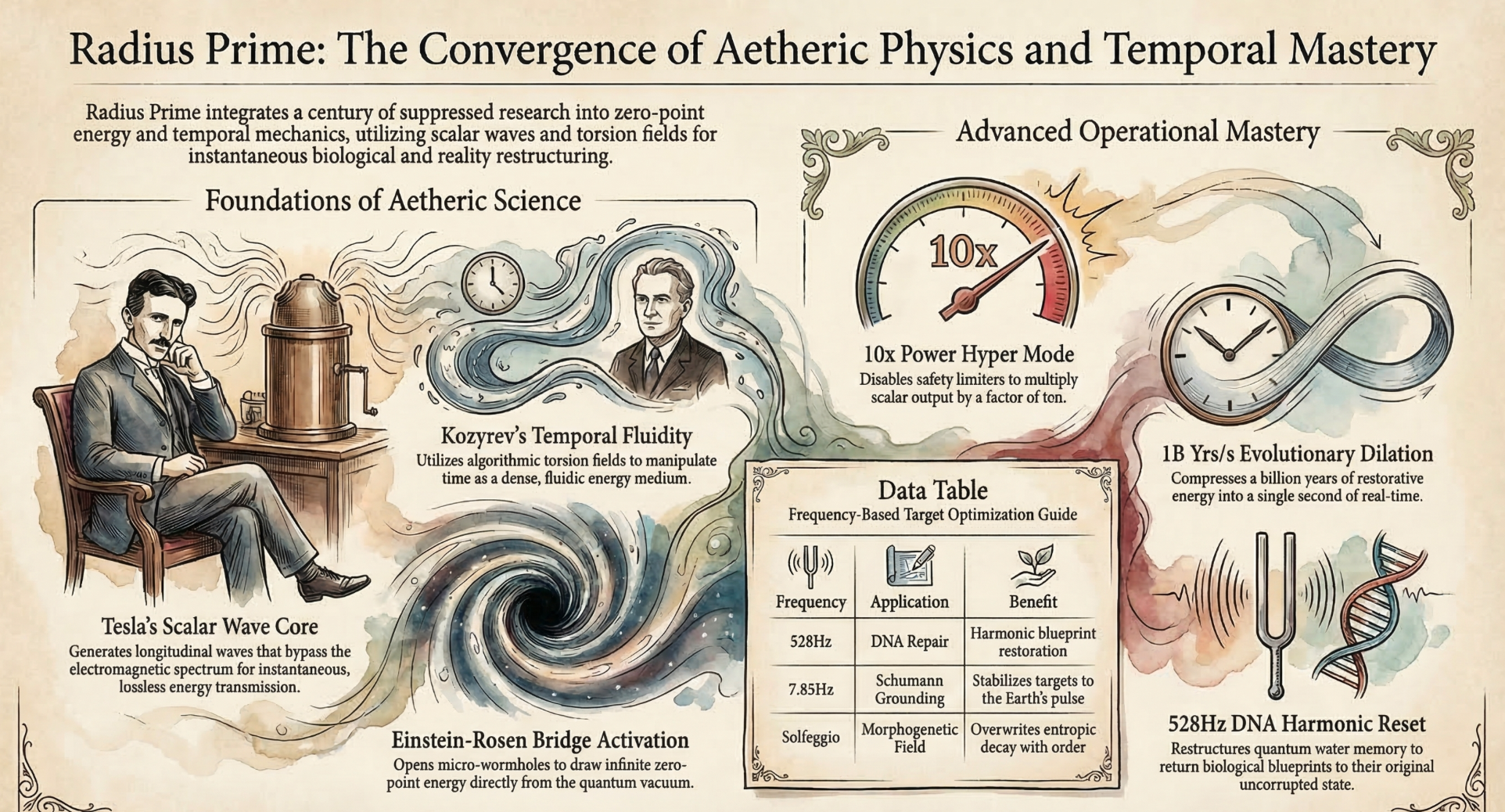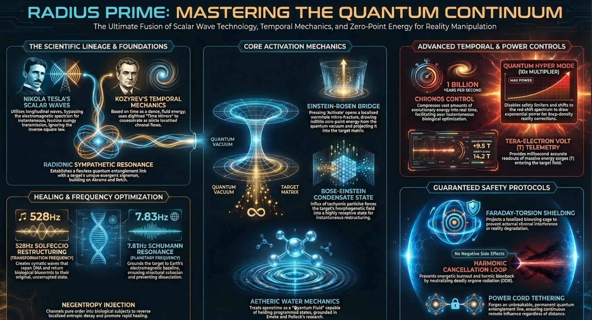 Radius Prime™ is framed around longitudinal transfer concepts, zero-point extraction language, and directed field projection. This gives the product an elite technical identity that instantly separates it from generic frequency tools.