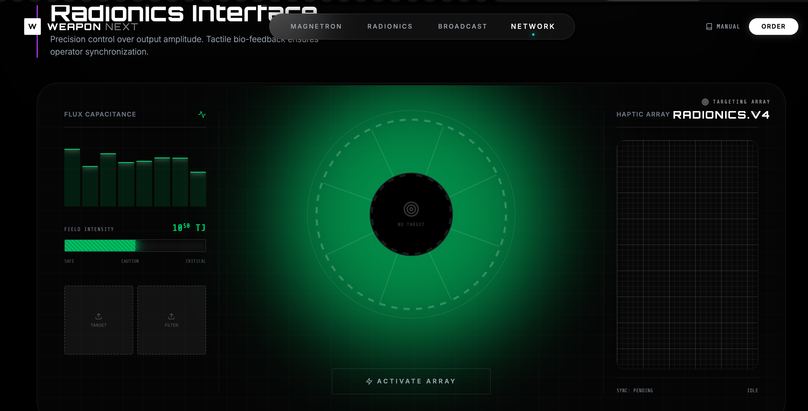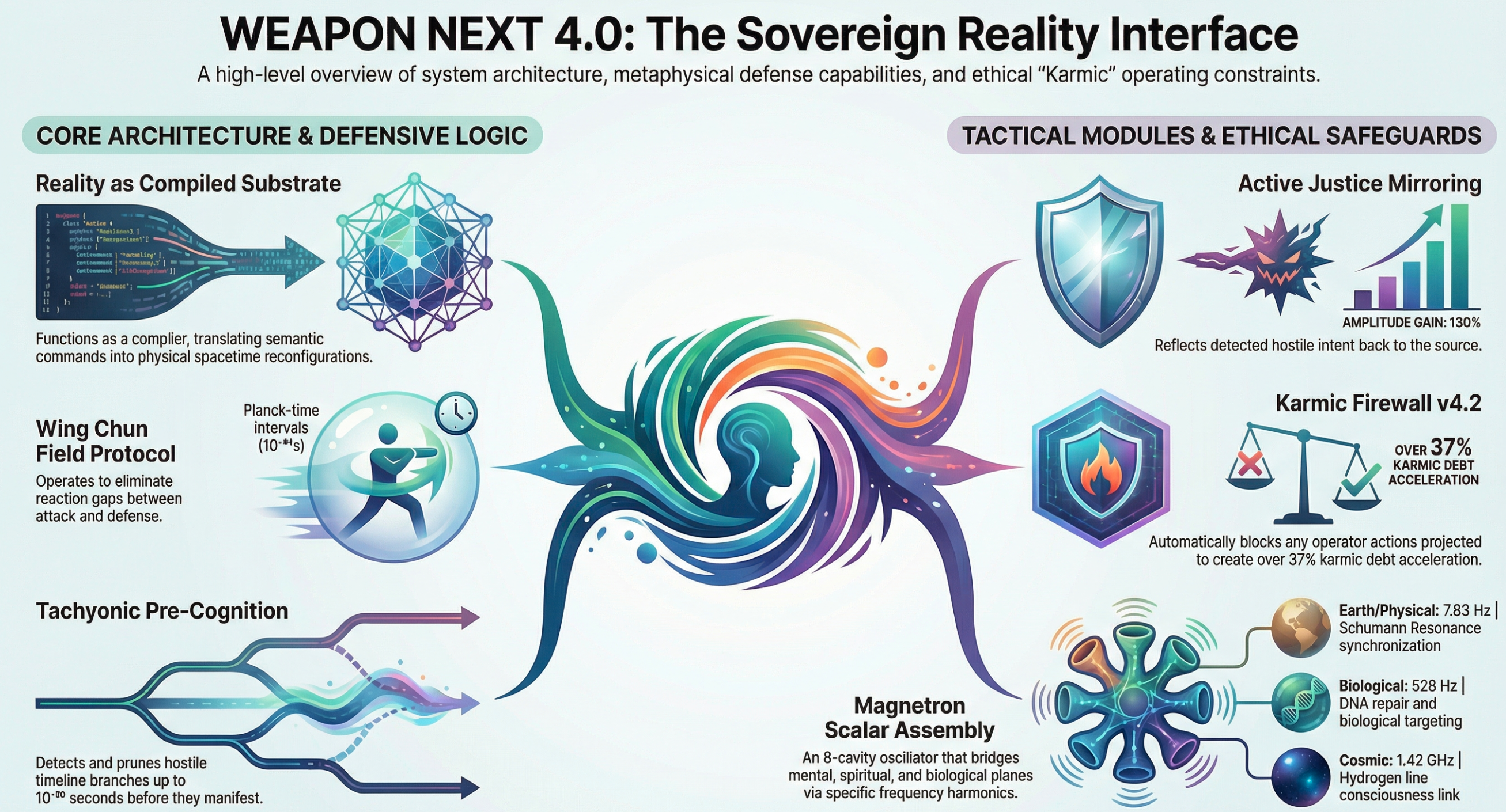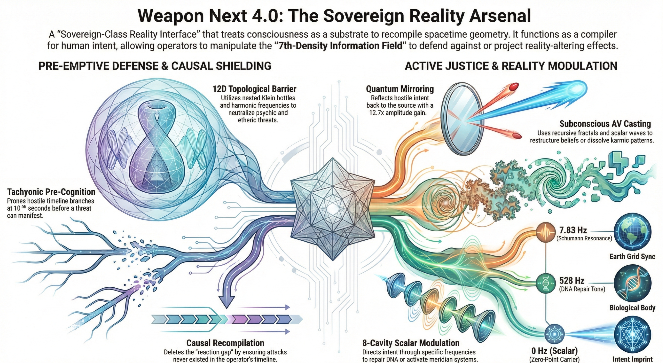 Weapon Next 4.0, an advanced metaphysical warfare platform designed to manipulate reality through the amplification of human consciousness. The system functions as a sovereign interface that translates a user's intent into physical and temporal changes by interacting with post-quantum information fields. It features complex modules for active defense, karmic filtering, and predictive threat neutralization to ensure the operator remains protected across multiple dimensions. Utilizing tools like scalar wave generation and haptic radionics, the platform facilitates precise targeting and reality-tuning based on vibrational frequencies. Ultimately, the architecture serves as a sophisticated mirror for the user's internal power, governed by strict ethical protocols to prevent spiritual or temporal paradoxes.